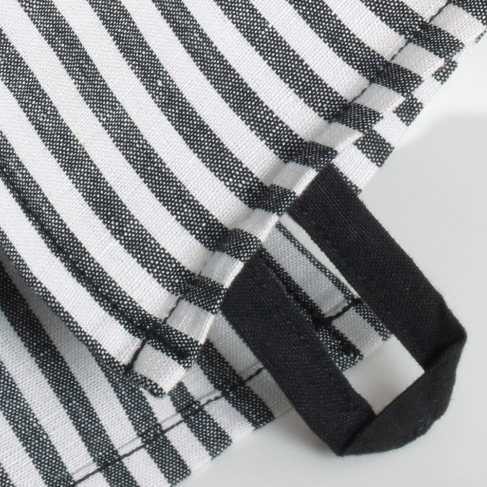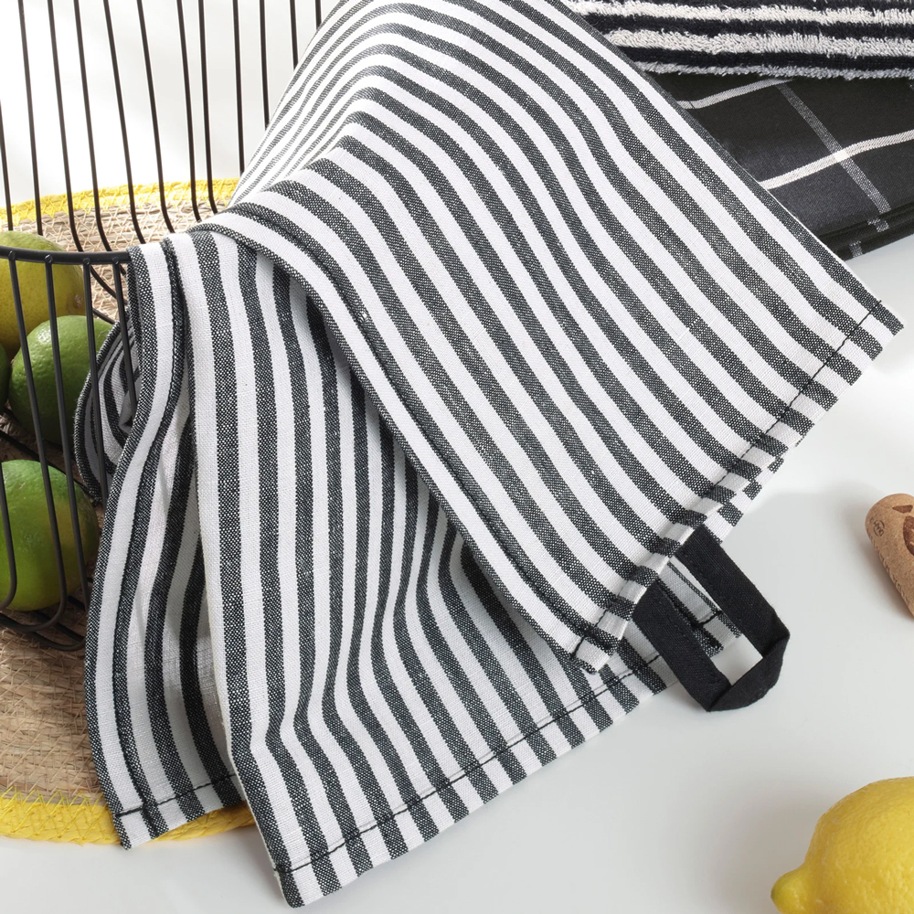 Die Cawö Geschirrtücher Zoom Streifen aus Halbleinen präsentieren sich in cooler Black & White Optik.